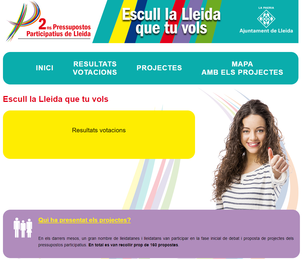 En total, han estat 3.023 lleidatans i lleidatanes qui han escollit entre les 128 propostes (43 projectes de ciutat, d’entre 50.000 i 200.000 euros de pressupost, i 83 projectes de barri, de menys de 50.000 euros). Aquesta xifra suposa un 2,65% del cens, en el qual eren inclosos tots els majors de 16 anys.