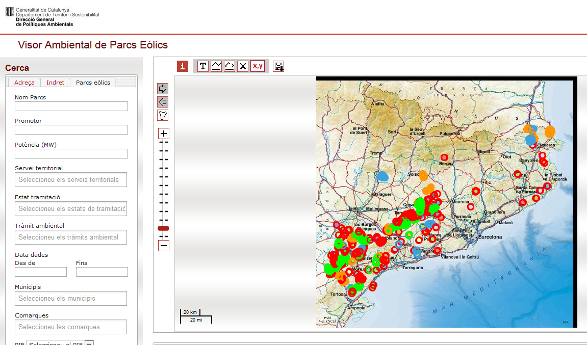 El Visor Ambiental de Parcs Eòlics dóna informació completa sobre la localització, característiques i estat de tramitació dels parcs eòlics i els corresponents generadors.