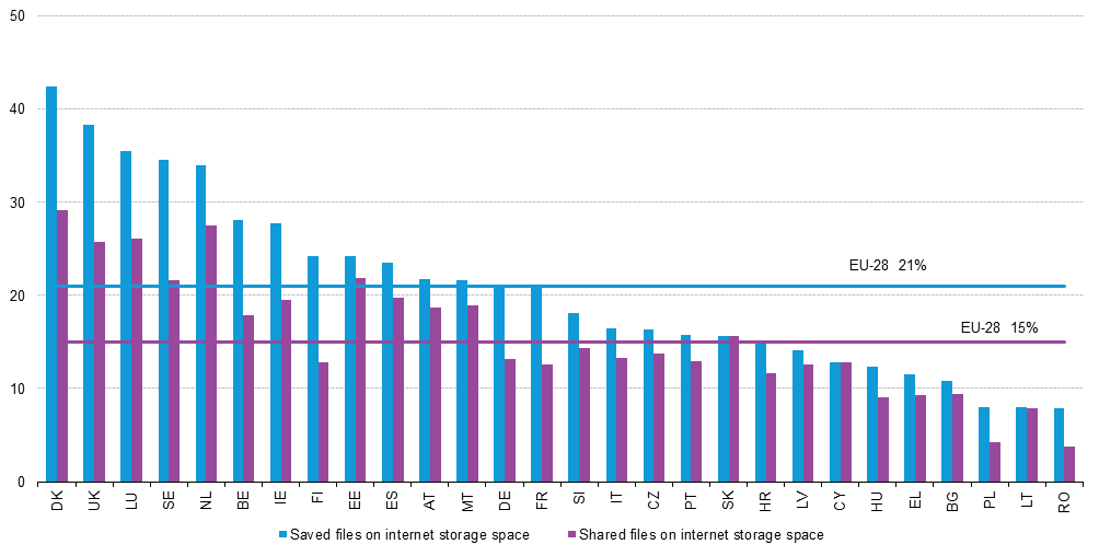 L’Estat membre amb la major proporció de persones que utilitzen serveis al núvol per desar arxius va ser Dinamarca (42%), seguit pel Regne Unit (38%), Luxemburg i Suècia (35%) i els Països Baixos (34%). Els mateixos països, a més d’Estònia, també van registrar els nivells més alts d’ús de serveis en el núvol per compartir arxius (entre 22% i 29%). Menys d’un de cada deu persones a Polònia, Lituània i Romania utilitzen serveis en el núvol per guardar o compartir arxius.