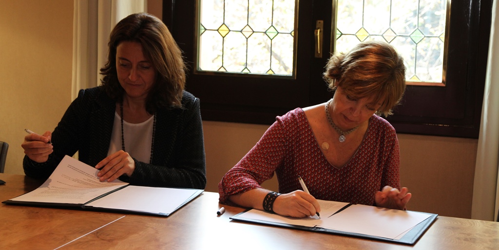 La presidenta de l’AOC i consellera de Governació i Relacions Institucionals, Meritxell Borràs, i la presidenta de la Diputació de Barcelona, Mercè Conesa, han signat aquest migdia el conveni de col·laboració entre aquestes entitats per tal d’impulsar e-SET.