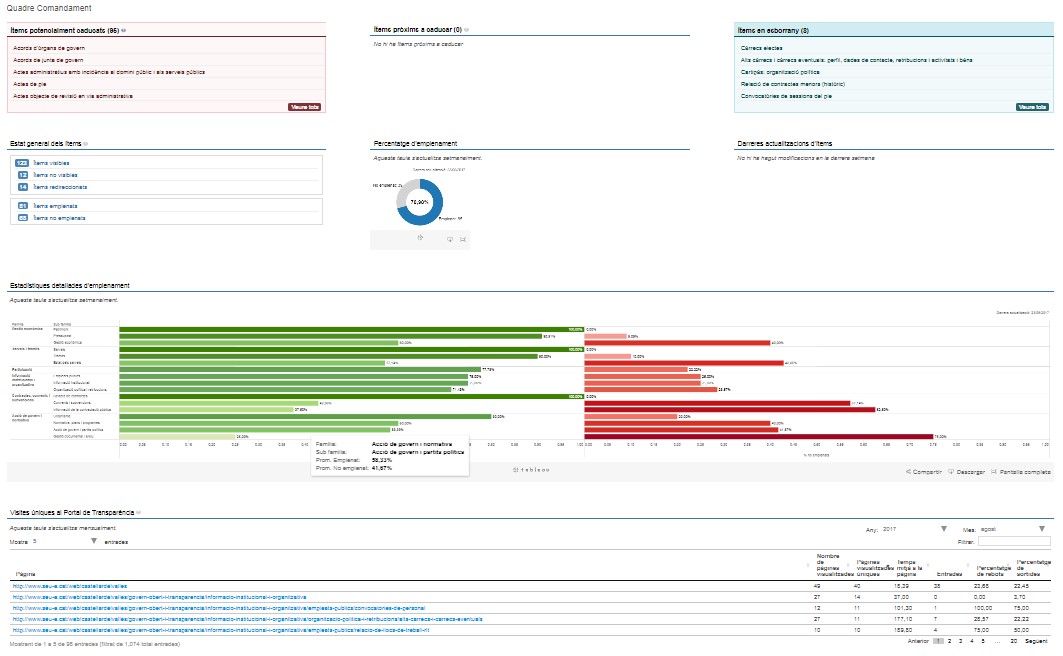 Aquest quadre de comandament inclou diferents seccions amb la intenció de facilitar d’una manera àgil a l’editor del portal conèixer l’estat d’actualització dels seu ítems, amb especial rellevància per aquells que puguin trobar-se potencialment caducats, pròxims a caducar o en estat esborrany. El quadre també vol potenciar l’anàlisi general de l’estat de tots els ítems agrupant-los segons visibilitat, redireccionament o emplenament, amb accessos personalitzats a cada tipologia, així com percentatges d’emplenament o espai dedicat a les darreres actualitzacions.
