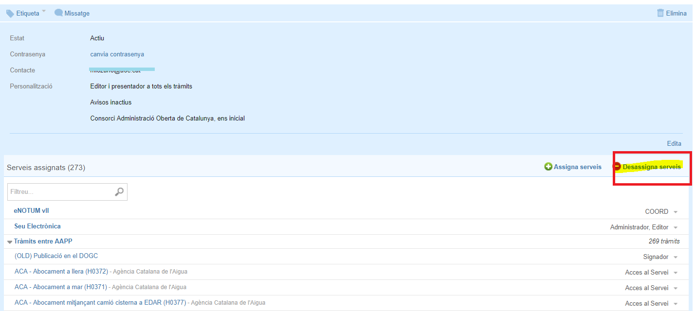 S’ha millorat la Gestió d’Usuaris d’EACAT per tal que resulti més fàcil i usable per als gestors d’usuaris de cada ens. A partir d’ara es podran desassignar serveis de forma automatitzada. Podreu fer-ho des de Configuració/Serveis i un cop aquí prémer Desassigna serveis.