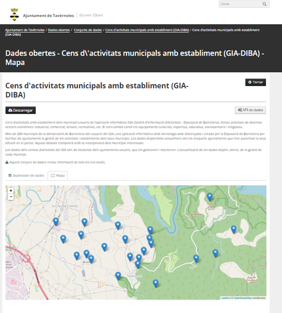 Actualment hi ha 153 ens que disposen del conjunt de dades actiu, publicat en format CSV amb el nom “Cens d’activitats municipals amb establiment (GIA-DIBA)”, fent molt senzilla la consulta del cens tant en format taula (llistat), com mitjançant un mapa al portal de dades obertes de cada ens.