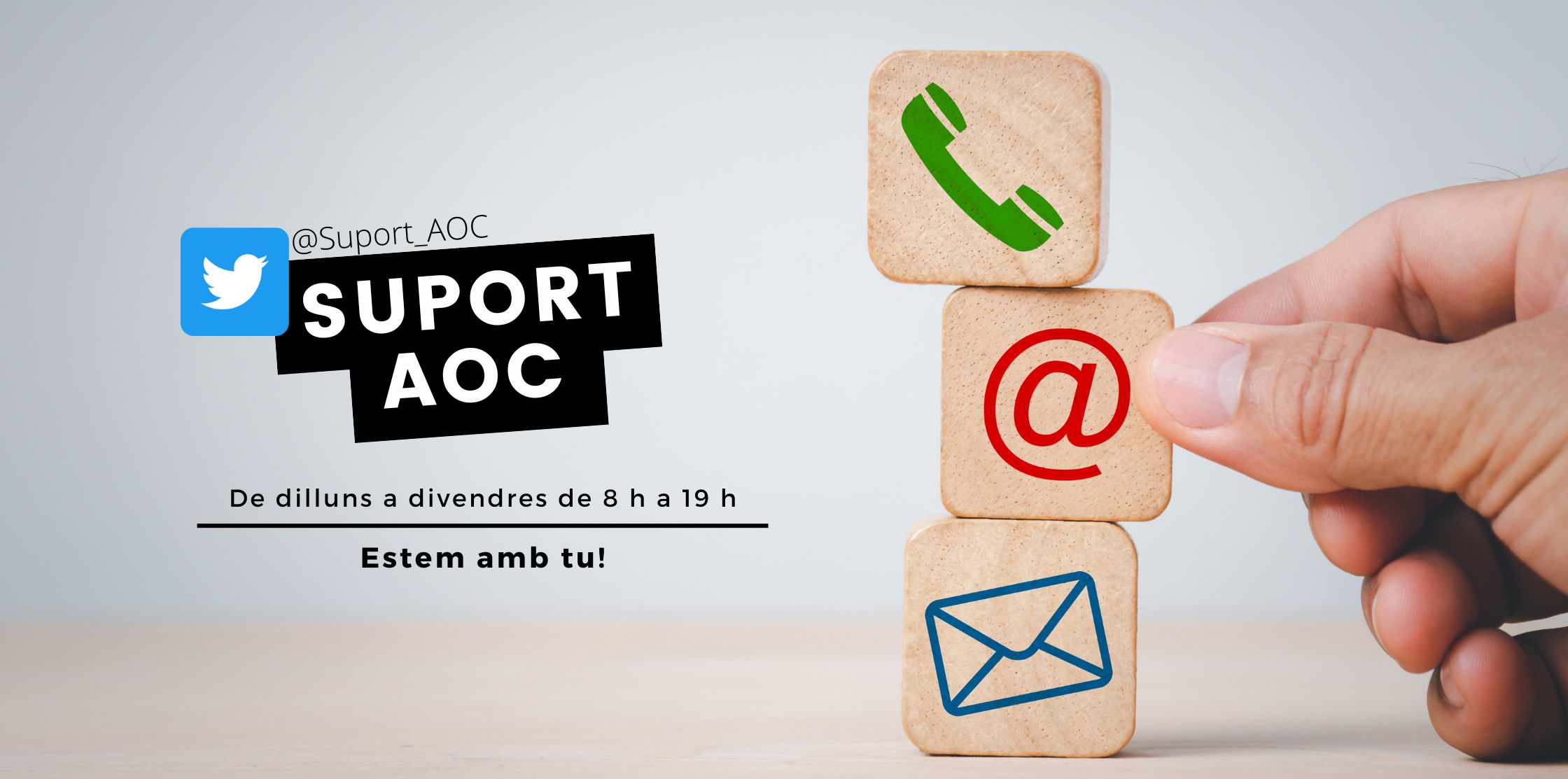 El Twitter de @Suport_AOC et manté al dia en tot moment de l’estat dels serveis de l’AOC: incidències actives, properes intervencions, canvis i millores dels serveis, recordatoris de fi de termini d’alguns tràmits, l’agenda de formacions i activitats relacionades amb l’administració digital, etc. A més a més, hi trobaràs píndoles informatives de cada servei i claus per resoldre les consultes més freqüents i si tens algun dubte, conversa amb nosaltres o bé envia’ns un missatge directe.