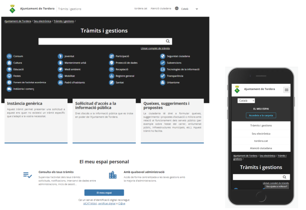 Catàleg de tràmits amb e-TRAM 2.0 de l’Ajuntament de Tordera des d’un ordinador i un mòbil
