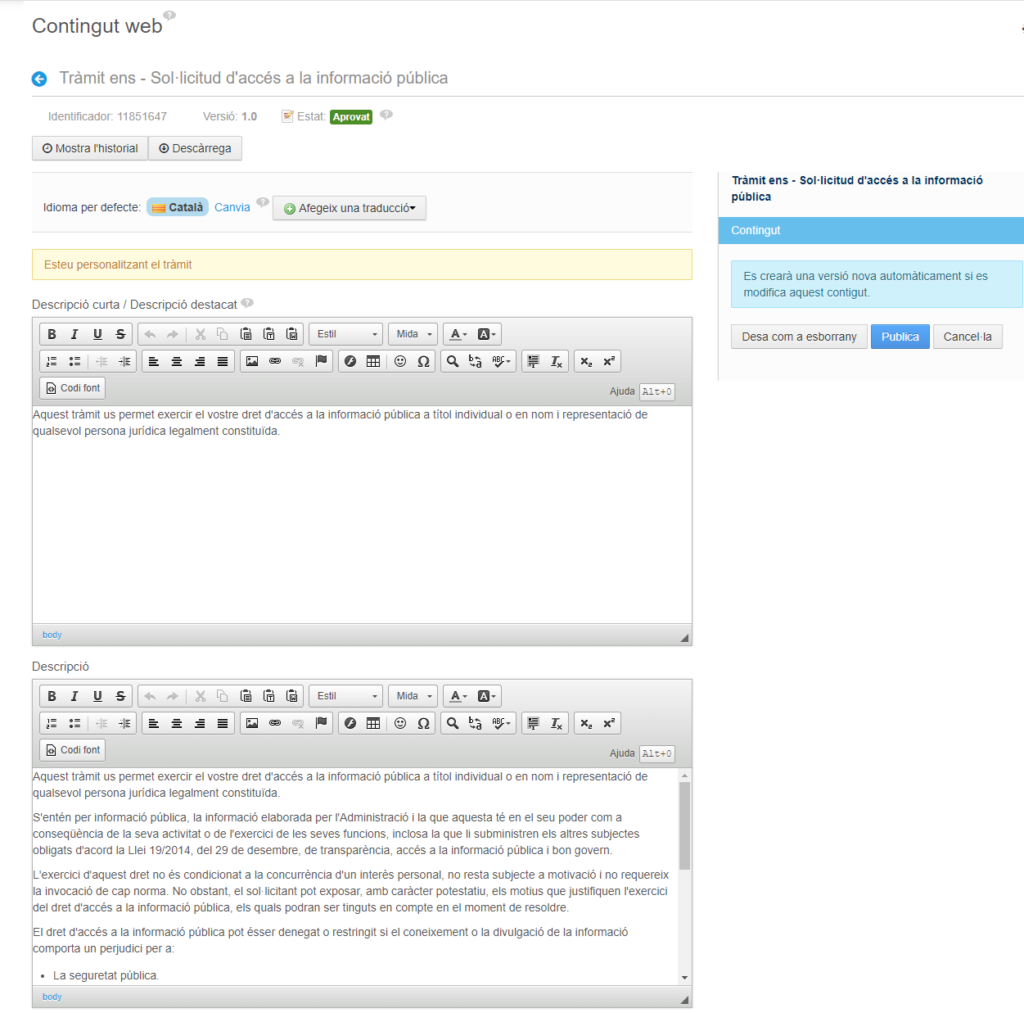 Pel que fa a la gestió, l’e-TRAM 2.0 disposa d’un nou entorn d’edició integrat amb els serveis i rols d’usuari d’EACAT, amb la possibilitat d’autogestió del catàleg de tràmits i formularis mitjançant una solució còmoda, àgil i senzilla.