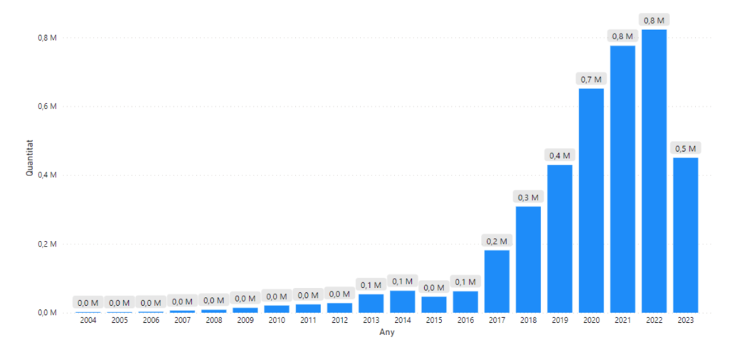 Evolució del nombre de tràmits realitzats. L’any 2023 inclou els primers sis mesos