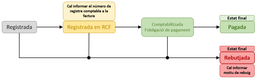 D’acord amb la resolució de 10 d’octubre de 2014, de la Secretaría de Estado de Administraciones Públicas y de la Secretaría de Estado de Presupuestos y Gastos, per la qual s’estableixen les condicions tècniques normalitzades del punt general d’entrada de factures electròniques, i tal com indica l’Ordre ECO/306/2015, de 23 de setembre, que regula el procediment de tramitació i anotació de les factures en el Registre comptable de factures en l’àmbit de l’Administració de la Generalitat de Catalunya i el seu sector públic, els estats de tramitació de les factures que les oficines comptables han de comunicar, són: