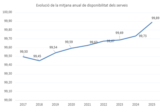 Aquesta xifra és un pas més, en la millora de la disponibilitat dels serveis en els darrers anys. Així doncs, la disponibilitat dels serveis del Consorci AOC ha experimentat una millora constant any rere any, des del 2018, assolint una mitjana de 99,89% el darrer any, com es pot veure en el següent quadre.