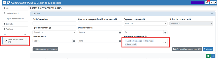 Al respecte de tots aquests contractes enviats a RPC a partir d’aquesta integració, us recordem que cal que reviseu l’apartat “Llistat d’enviaments a l’RPC” de la PSCP per identificar si algun enviament ha quedat en estat “Incorrecte”, “Amb advertències” o “Error tècnic”. En aquest cas caldrà identificar quina acció correctiva heu de portar a terme a les eines, tenint en compte el missatge incorporat al Resum de l’enviament.