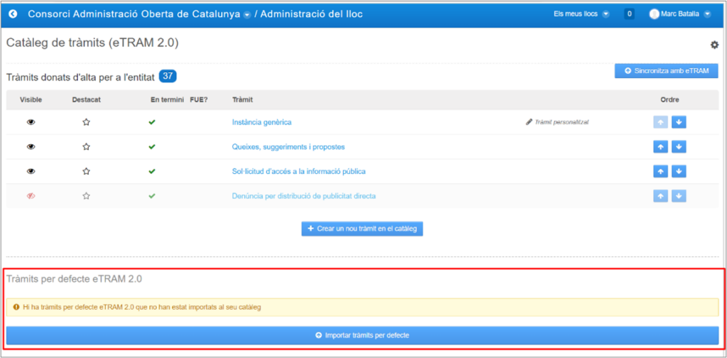 - Activar els tràmits per defecte del catàleg de tràmits d’Etram
