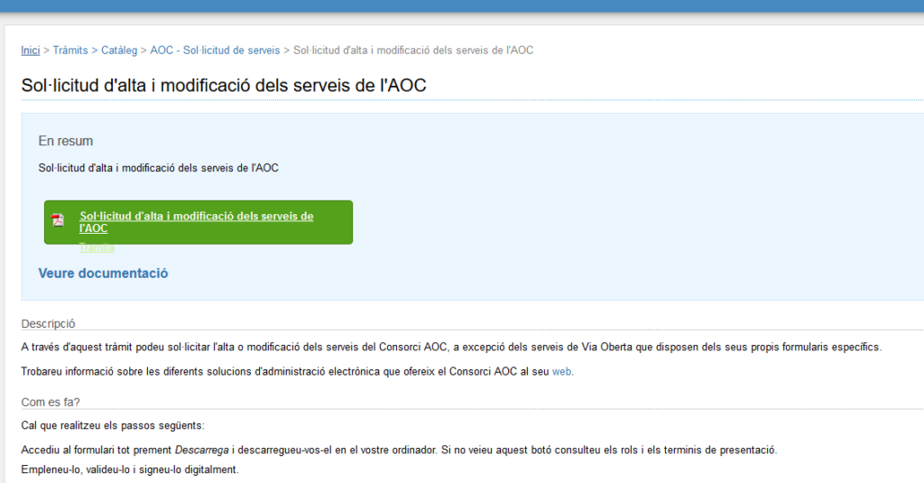 - Que per poder descarregar el formulari d’alta, cal que el gestor d’usuaris d’EACAT us hagi assignat permisos del “servei CAOC – Sol·licitud de Serveis”.